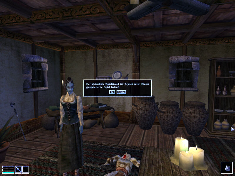 Dieser Tag hat mich bereits alles gekostet. Abgemagert und völlig von Lebenspunkten befreit, begebe ich mich zum lokalen Händler. Der dreht mir statt einer erholsamen Mahlzeit jedoch einen Feuerzauber an. Hungersnot oder blöd rumzündeln? Die Antwort ist klar! Leider setze ich, völlig unbeabsichtigt *hust*, den Rock der Assistentin in Brand. Sie klatscht mir eine und besiegelt erneut mein Schicksal.
