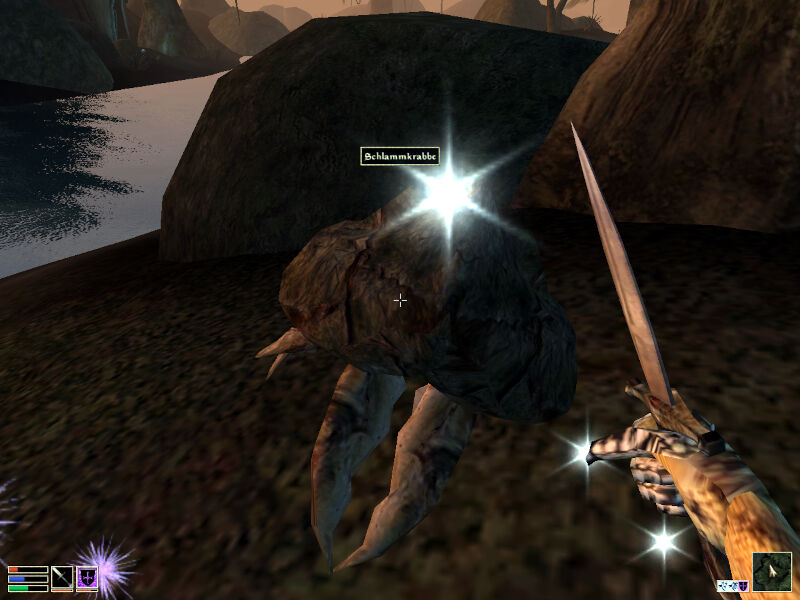 Hinter dem nächsten Felsen lauert mir unvermittelt eine bayrische Schlammkrabbe auf. Mein Liebesdolch mit weißen Zaubersternen bereitet ihr ein jähes Ende. Allerdings erleide auch ich schwerste Verletzungen und entschließe mich, meine Gesundheitspunkte durch ein kleines Nickerchen wieder aufzufüllen.